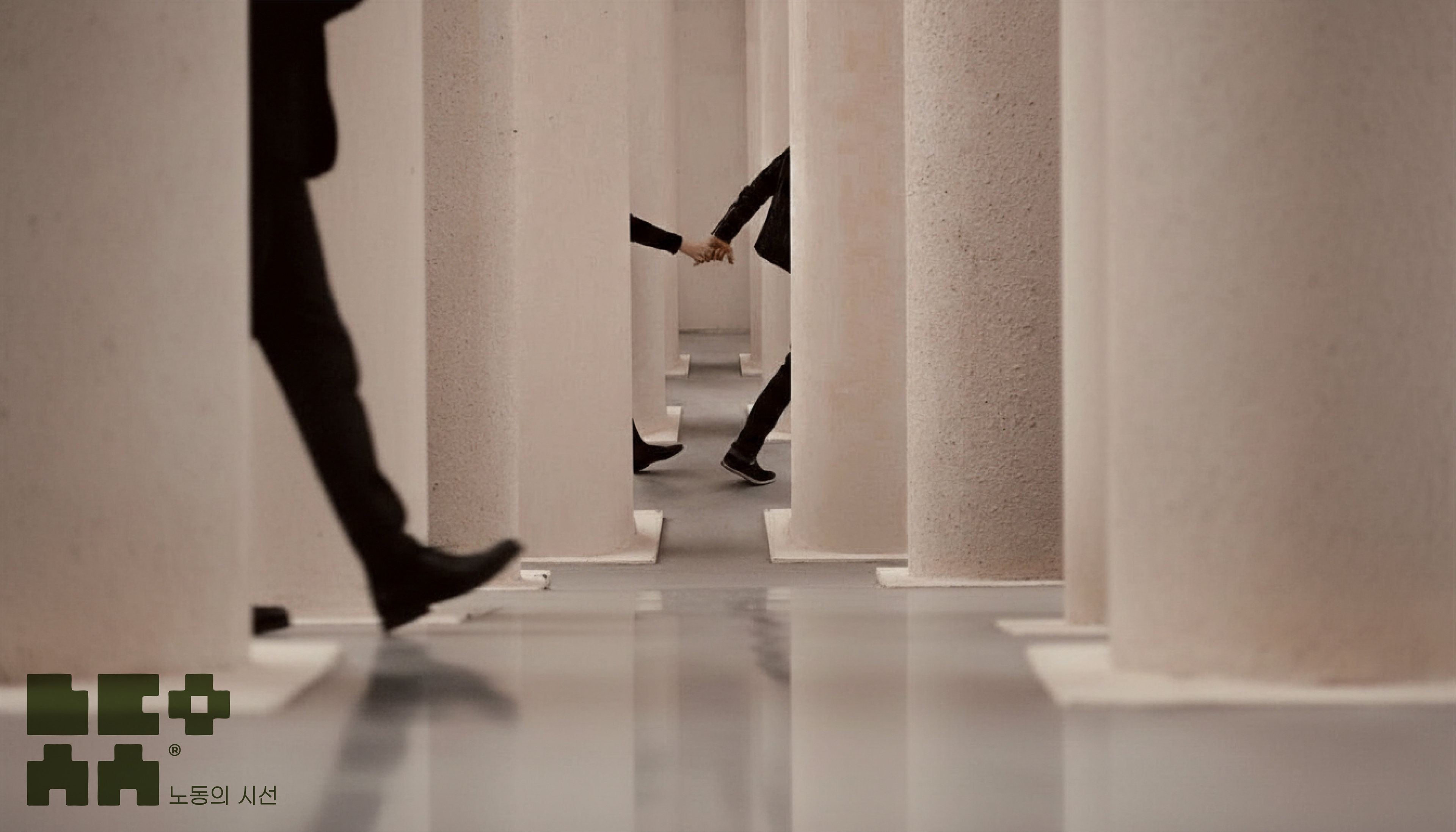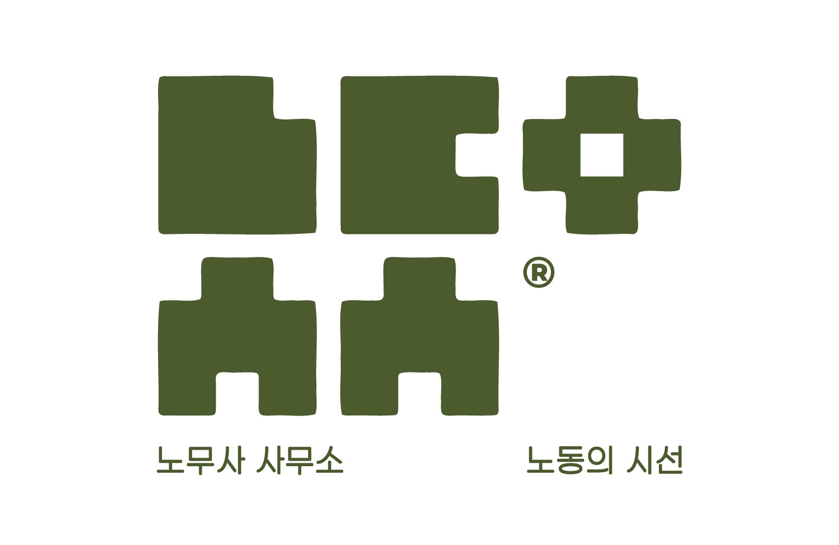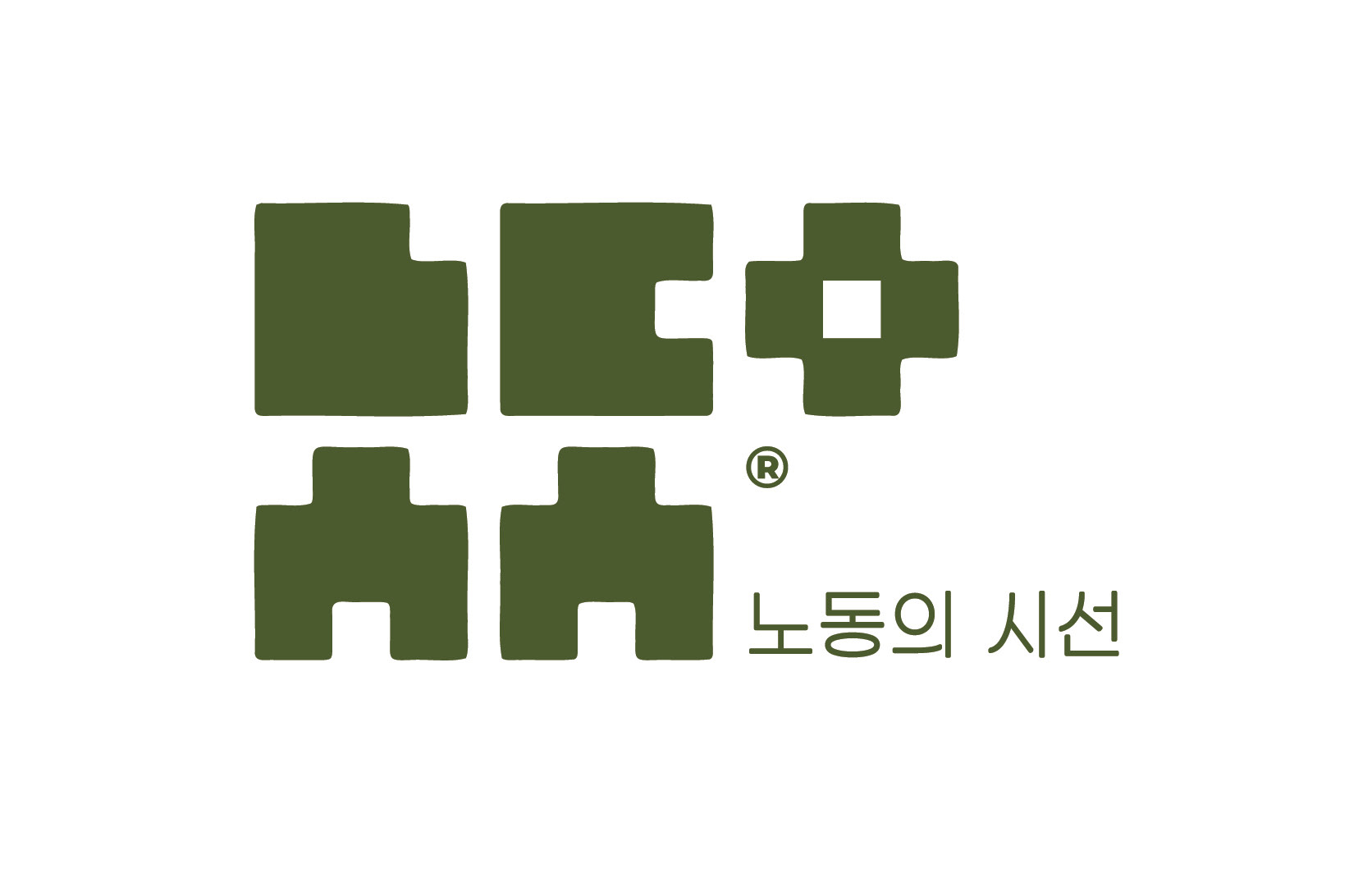 The four block forms — ㄴㄷ / ㅅㅅ — visually resemble the Korean word "노동 (labor)" at a glance. Add the ㅇ on the right, and the five shapes become the initials of the brand's full name: ㄴ·ㄷ·ㅇ·ㅅ·ㅅ for "노동의시선." A single mark that functions as both a word and an acronym — its meaning only reveals itself the moment you look.
