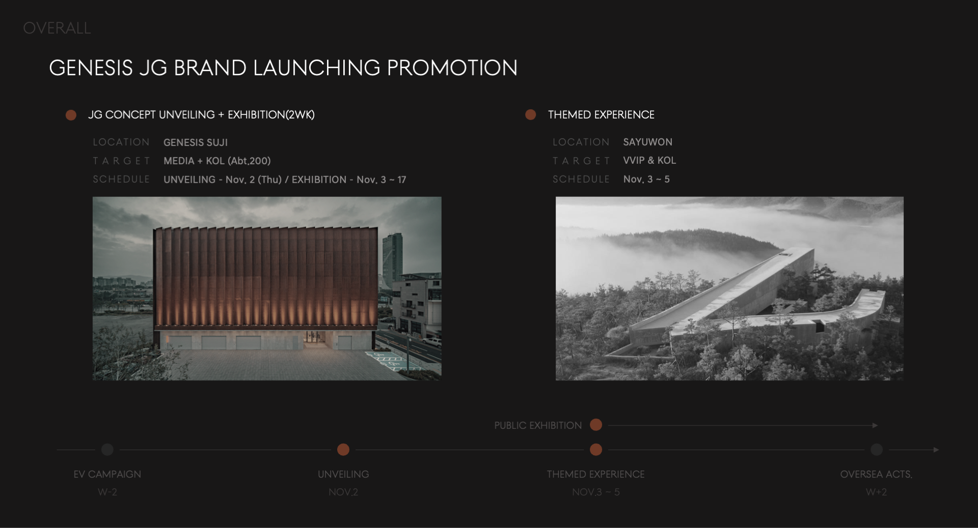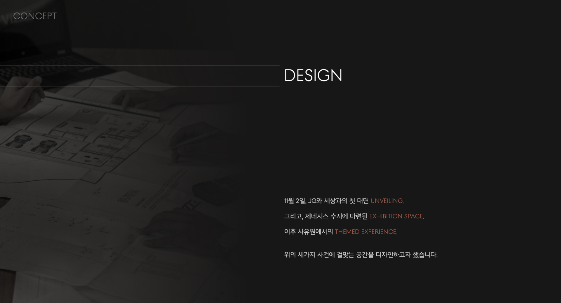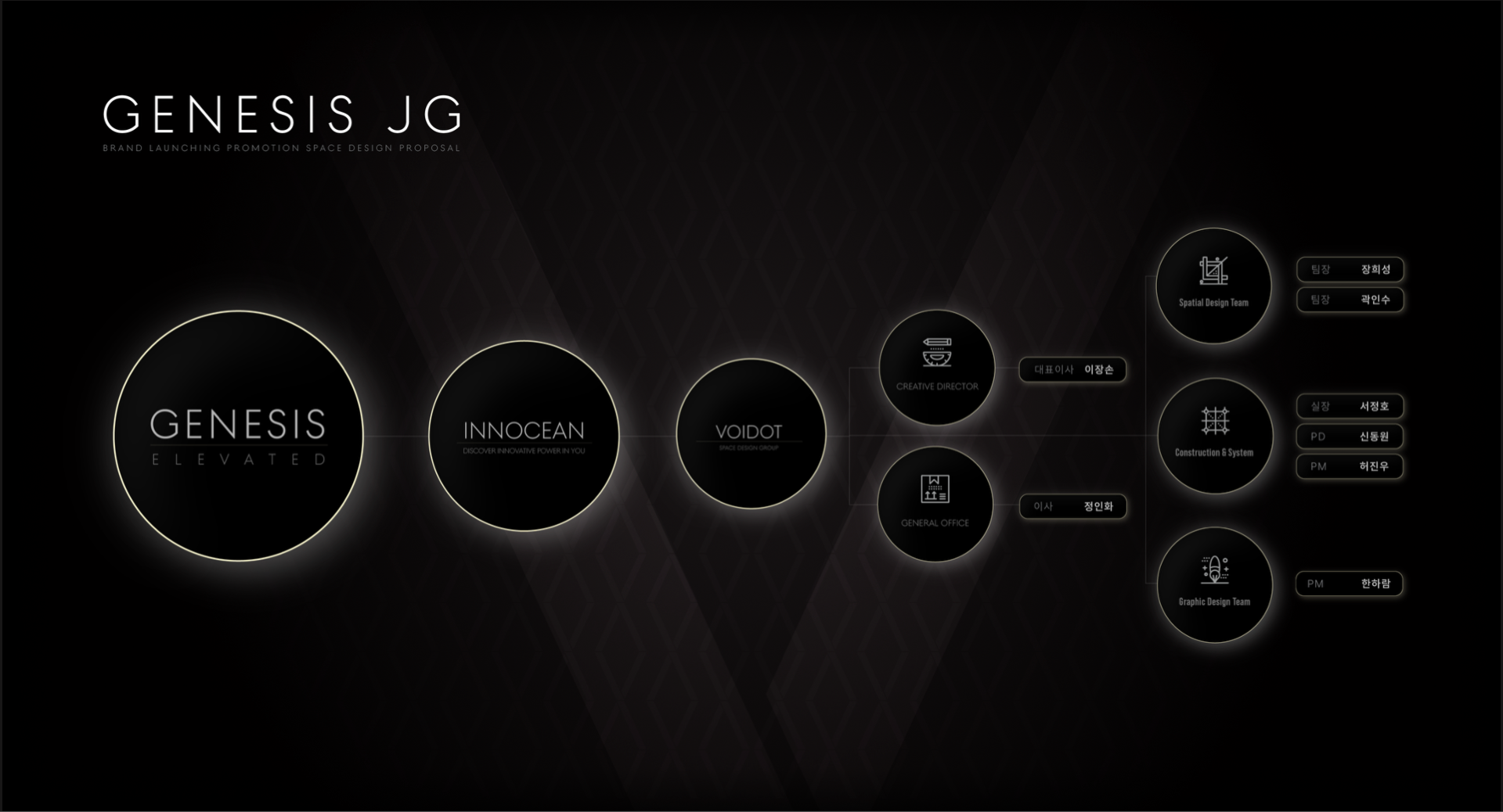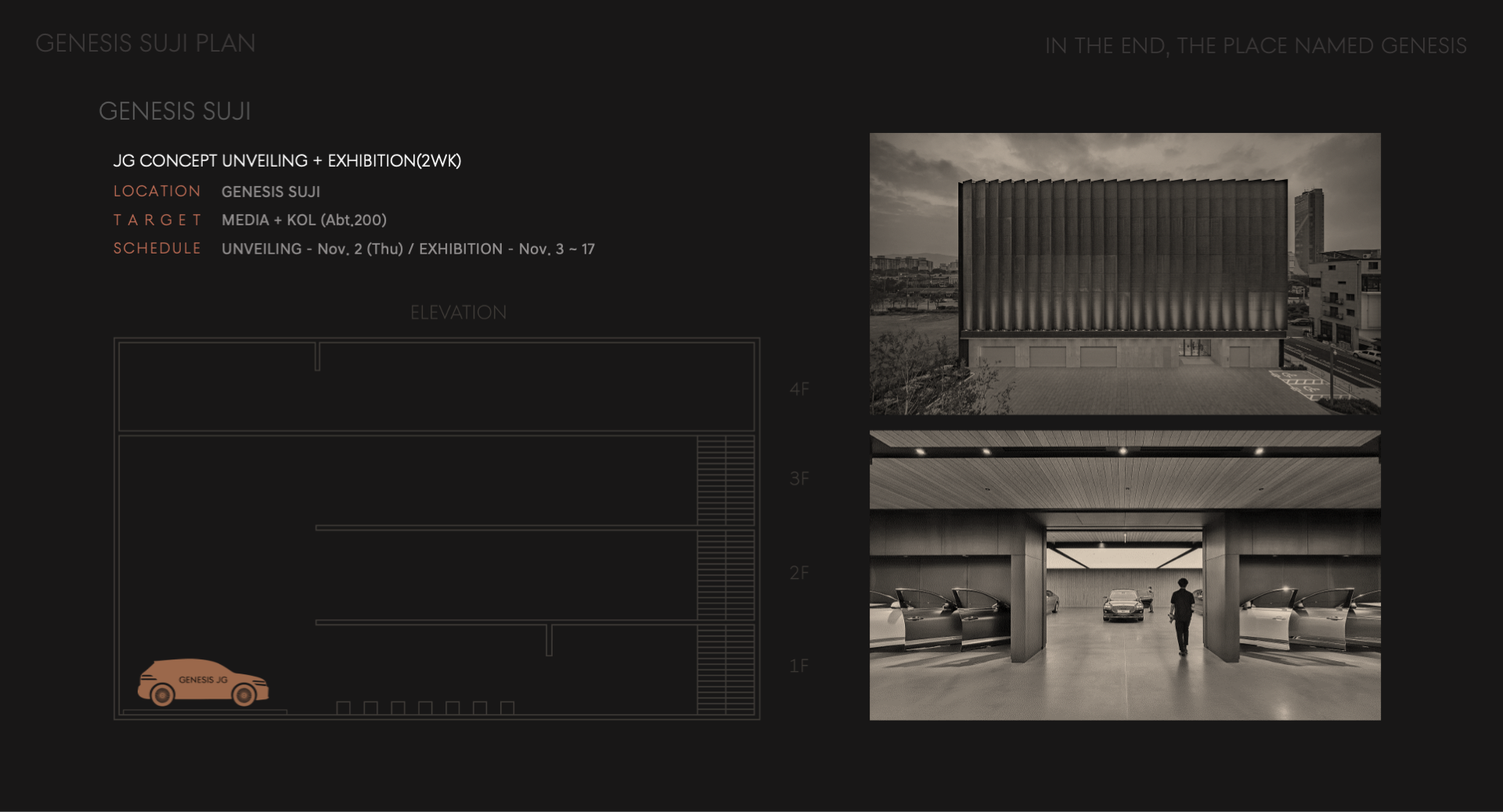 제네시스의 컨셉카 JG의 브랜드 런칭을 위한 공간 디자인, 언베일링 행사 비주얼 기획을 진행하였습니다.
