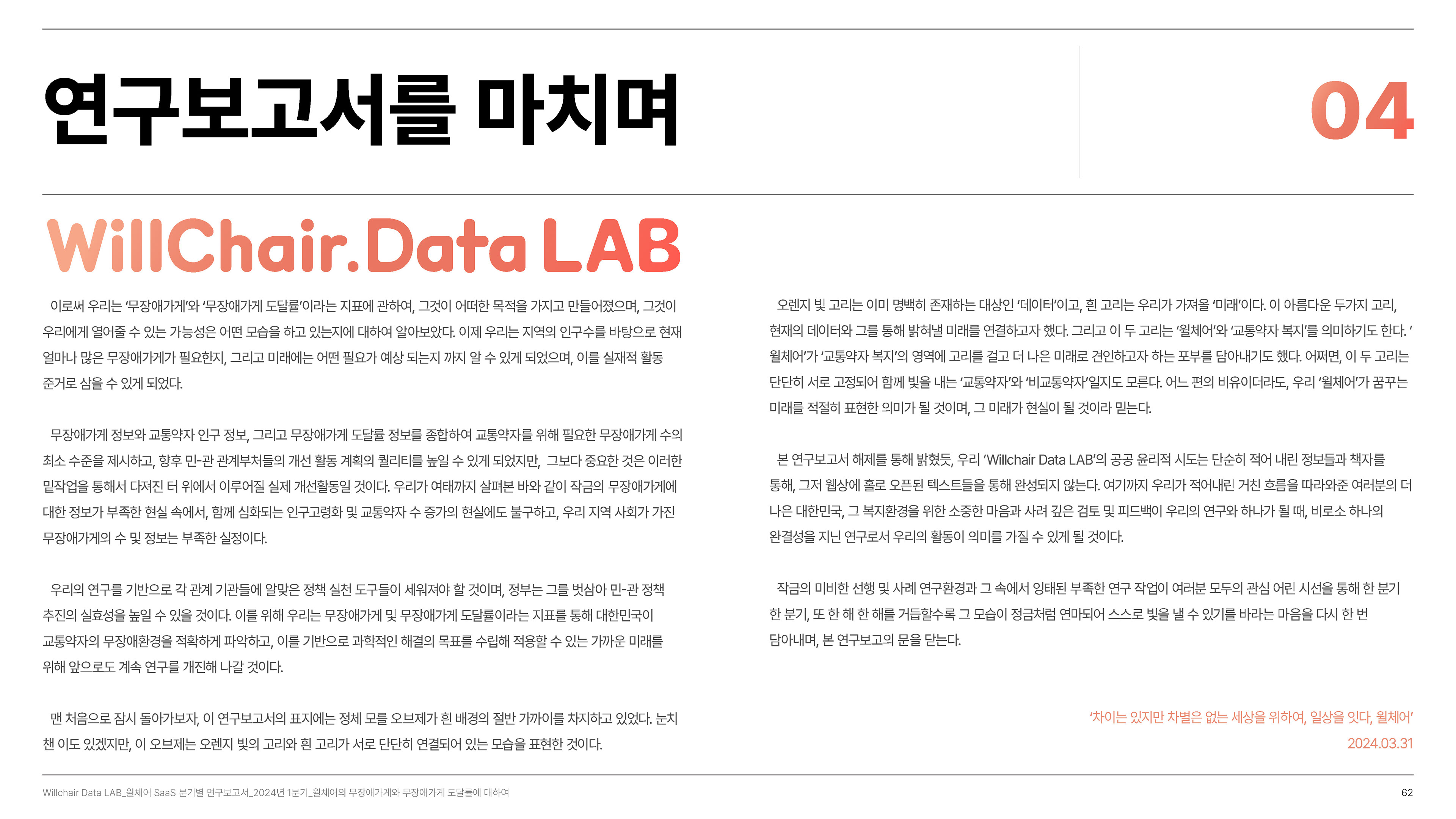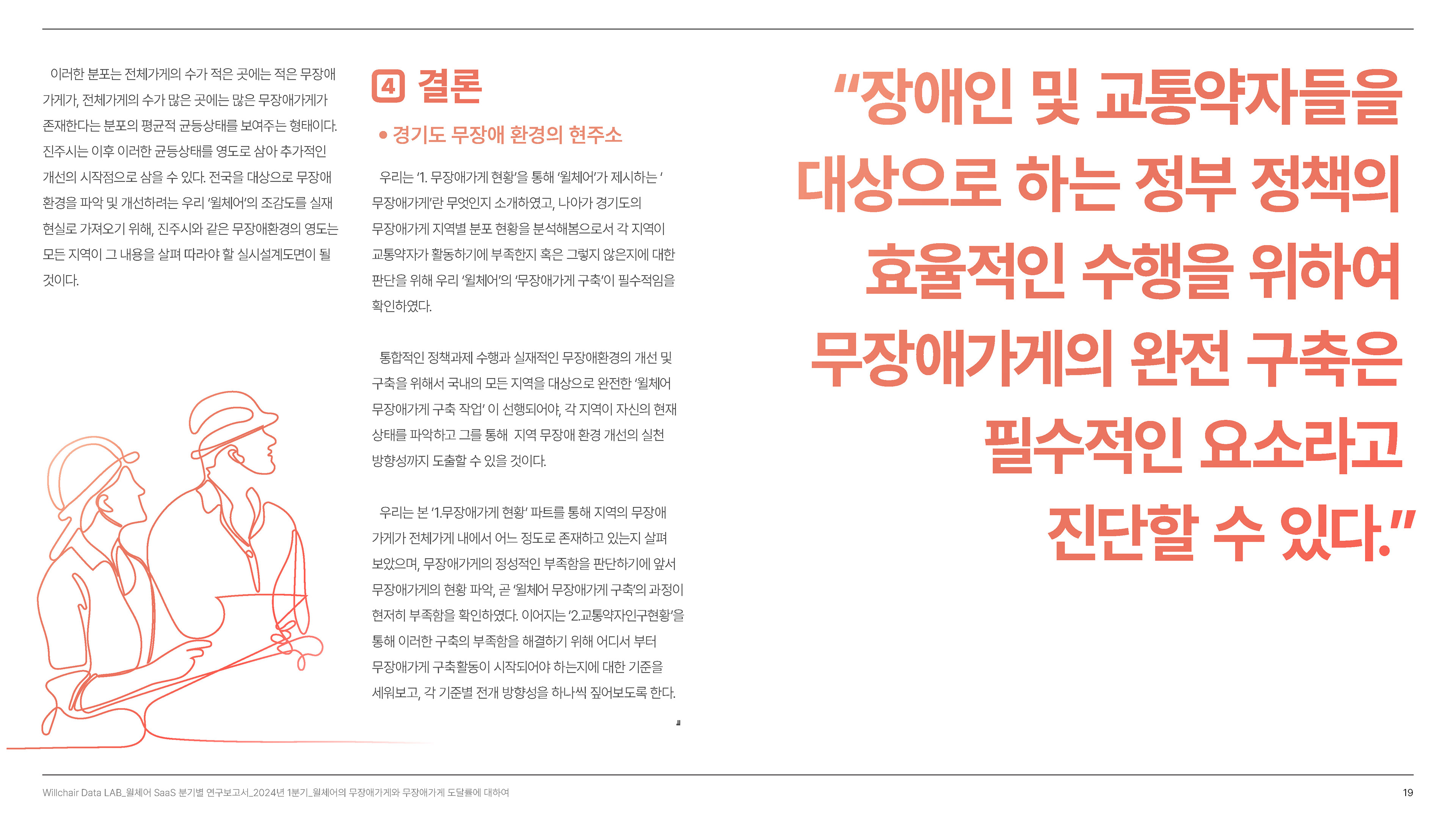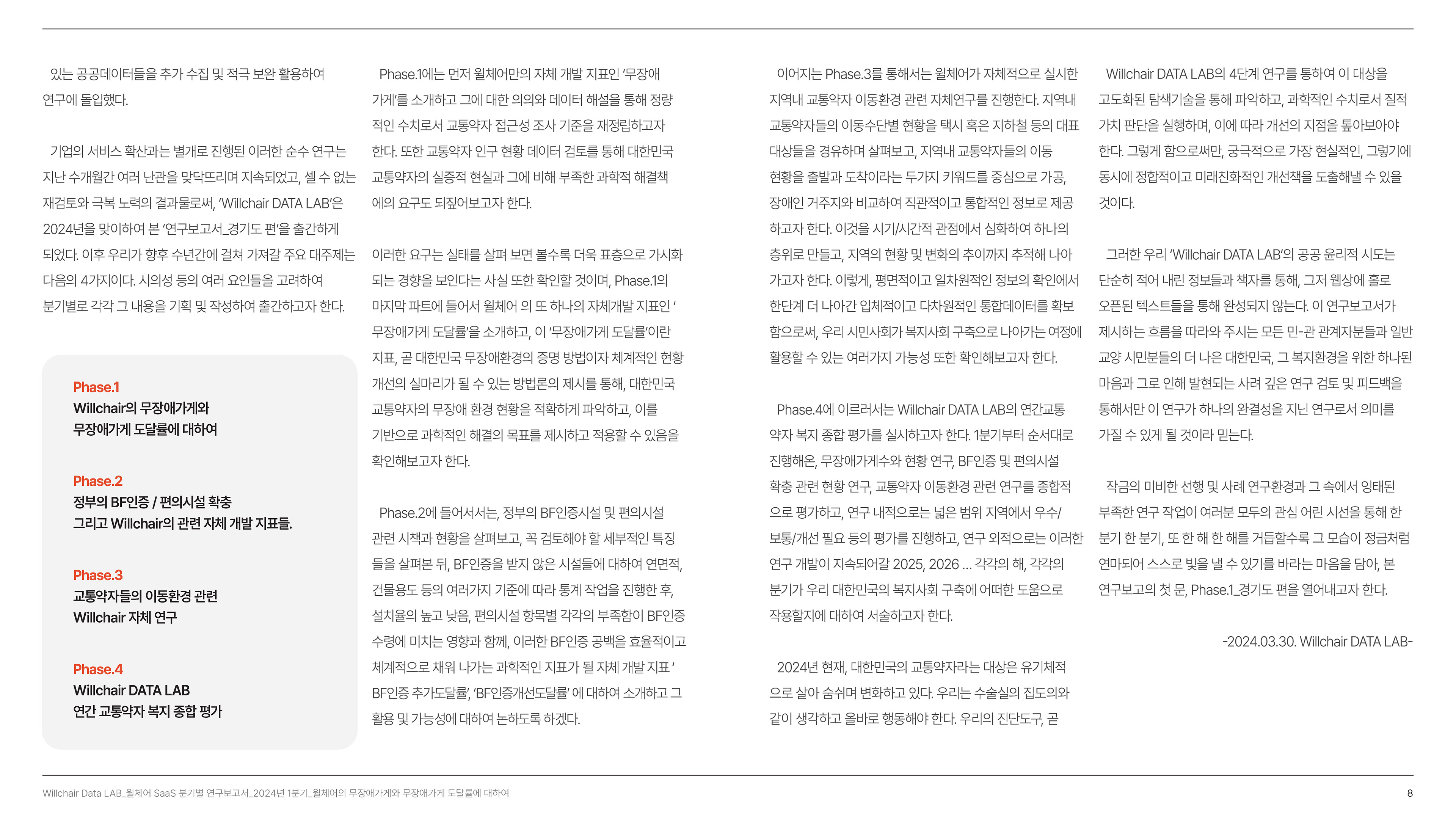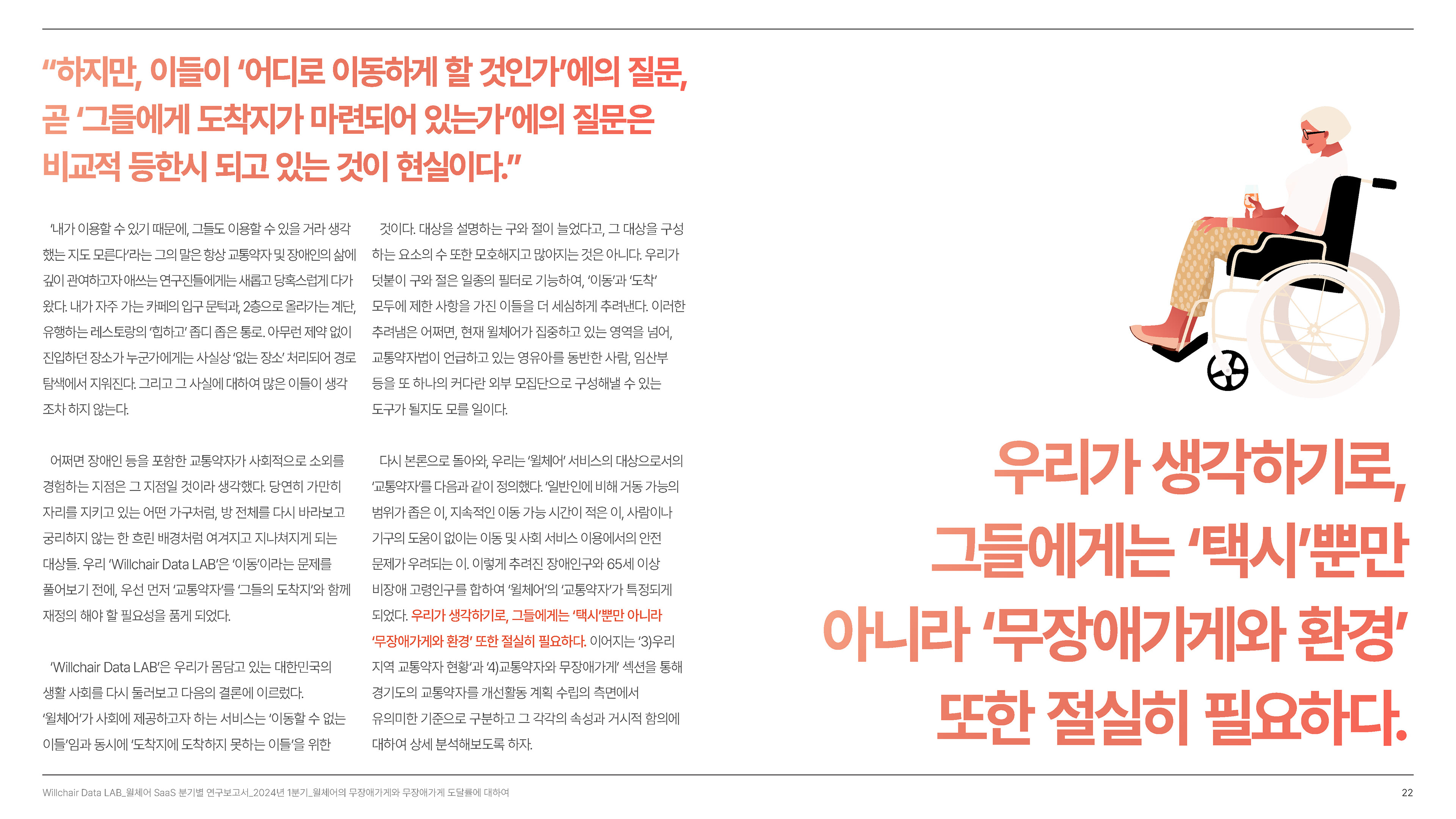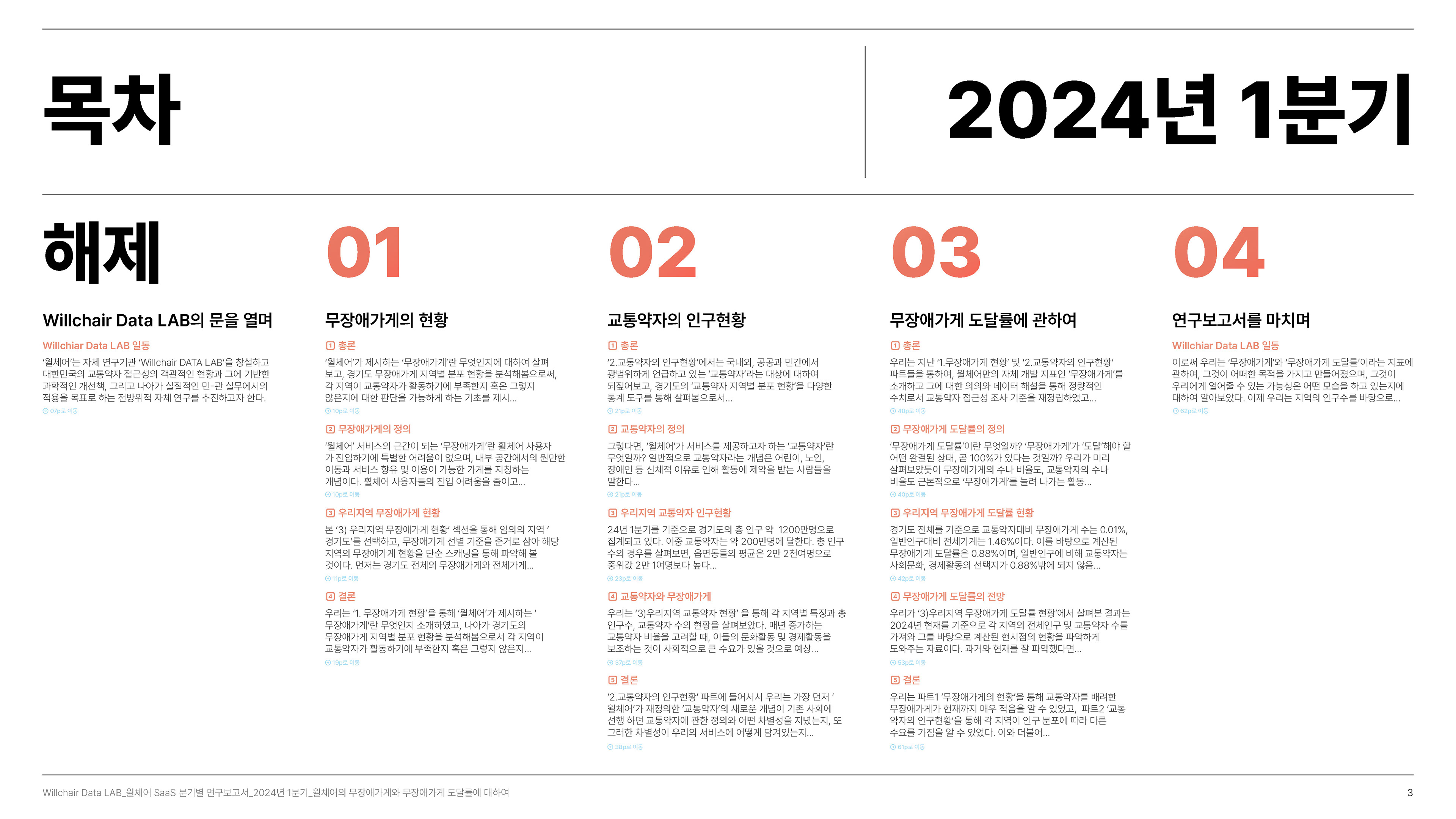 2024년 1분기의 연구성과를 담은 무장애 환경 데이터 분석 보고서를 기획 및 집필, 디자인하였습니다.